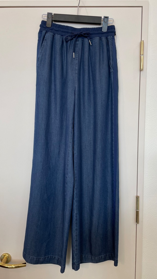 大人カジュアルにぴったりなサイドラインパンツです♪ セルロース素材で、軽く柔らかな履き心地になり、ウエストはリブゴムで、リボンで調整していただけます◎ 落ち感のある綺麗なシルエットラインです。 手洗い可能です。 お色はインディゴになります。 セルロースシャツのインディゴとset upが可能です。 *サイズ 38 総丈102㎝ 股下74㎝ ウエスト62㎝から *素材 再生繊維(セルロース)100% リブ部分 綿95% ポリウレタン5%