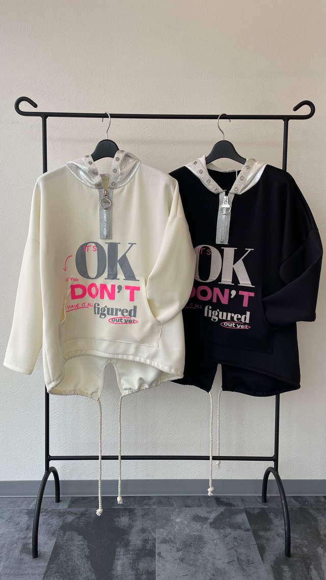 made in italyのソフトボンディングの柔らかいお素材で、存在感のあるロゴペイントが目を引く、インポートならではのデザインパーカーです♪ ラフになりがちなパーカーも、ペイントロゴのおかげで一気にこなれた印象になり、ハーフジップ仕様なので、少し開けて抜け感を出したり、着こなしのアレンジも楽しめます◎ 程よくゆとりのあるシルエットで、体のラインを拾いにくく、デニムやワイドパンツ、スカート合わせも◎ 一枚でサマになるので、忙しい朝にも頼れるアイテムです。 裾周りにラメ入りロープがぐるりと通り、後ろで絞れます。 インポートらしい遊び心とカジュアルさを兼ね備えた、大人のためのロゴパーカーです。 手洗い可能です。 *サイズ ワンサイズ 着丈(後)70㎝ (前)54㎝ 身幅54㎝ 肩幅70㎝ 袖丈41㎝ *素材 本体 ポリエステル62% ビスコース33% ポリウレタン5% フード ポリエステル100%