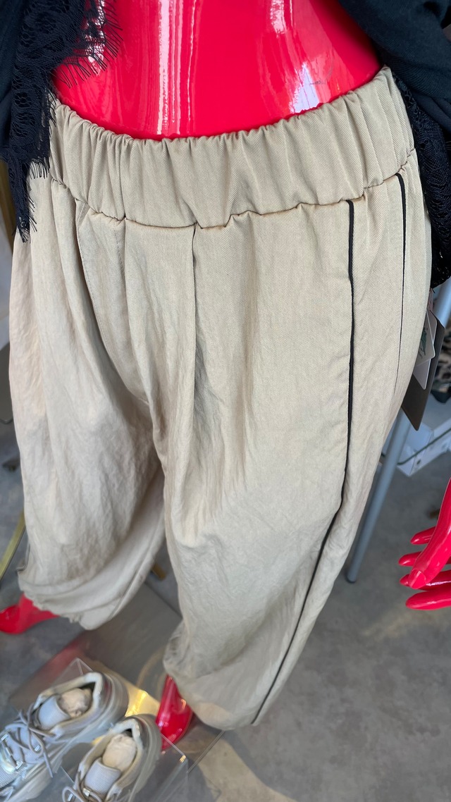 ゆるやかシルエットのペグトップパンツです♪ リラックスした履き心地ながらも今っぽいおしゃれなスタイルを演出します◎ ウエスト部分はゴム仕様で、内側に調節リボンが付きます。 両サイドにポケットが付きます。 さまざまなトップスと相性が良く、カジュアルからきれいめコーデまで幅広く活用できますよ◎ 手洗い可能です。 *サイズ 36 総丈97㎝ 股下67㎝ ウエスト62㎝ 38 総丈98㎝ 股下68㎝ ウエスト66㎝ *素材 ポリエステル100%