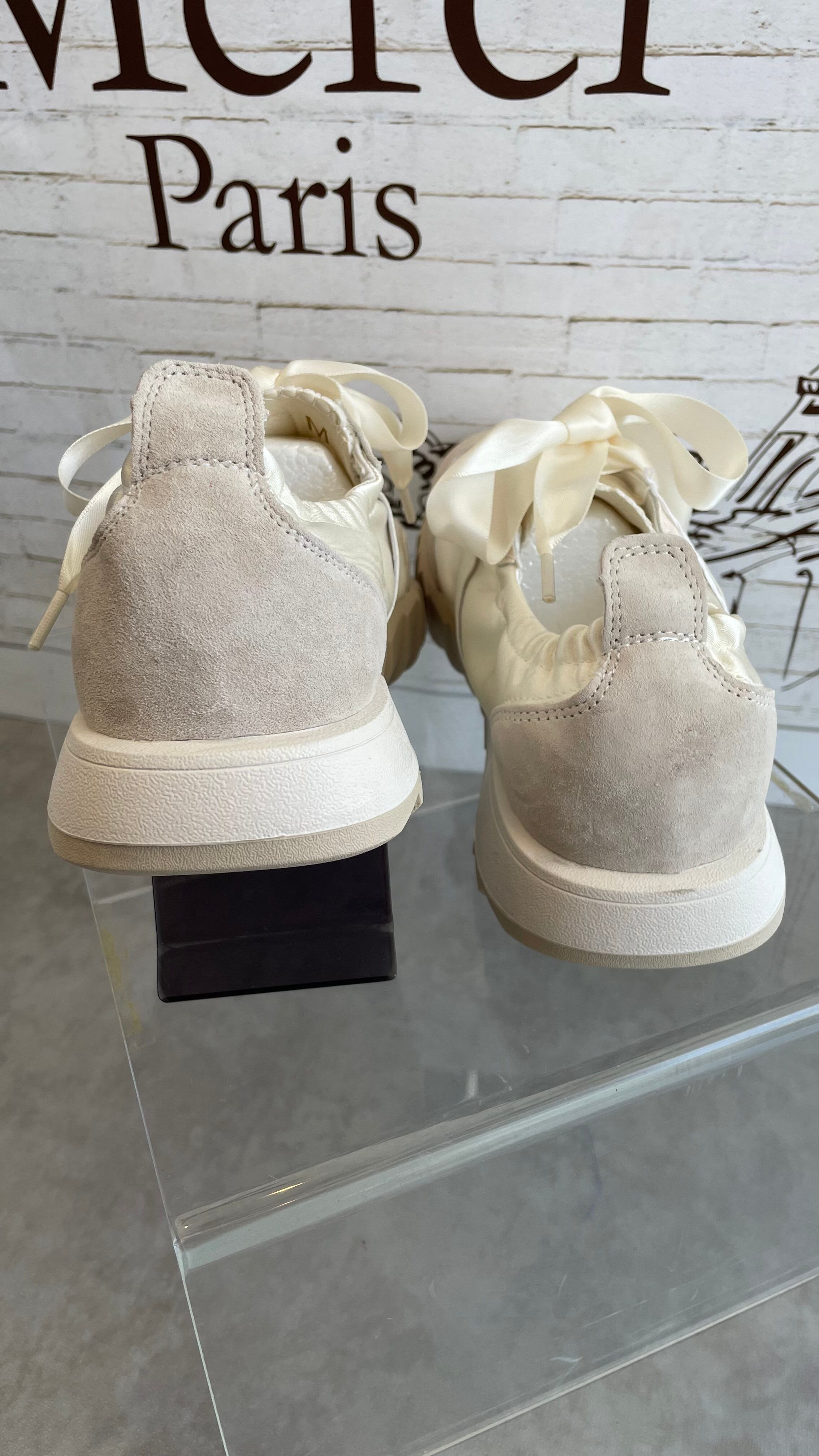 おしゃれなサテン素材とレザーで仕立てられたスニーカーです。