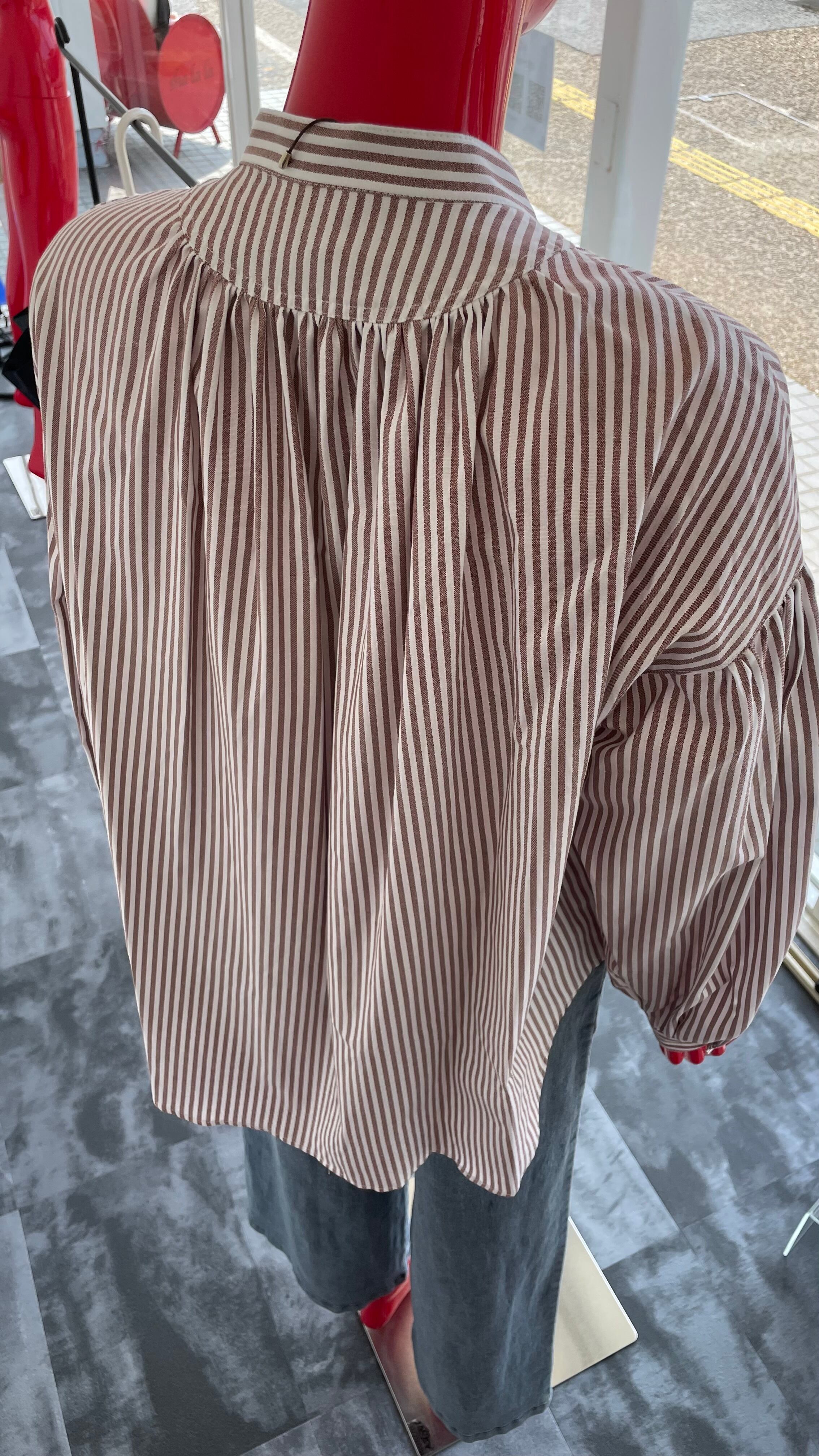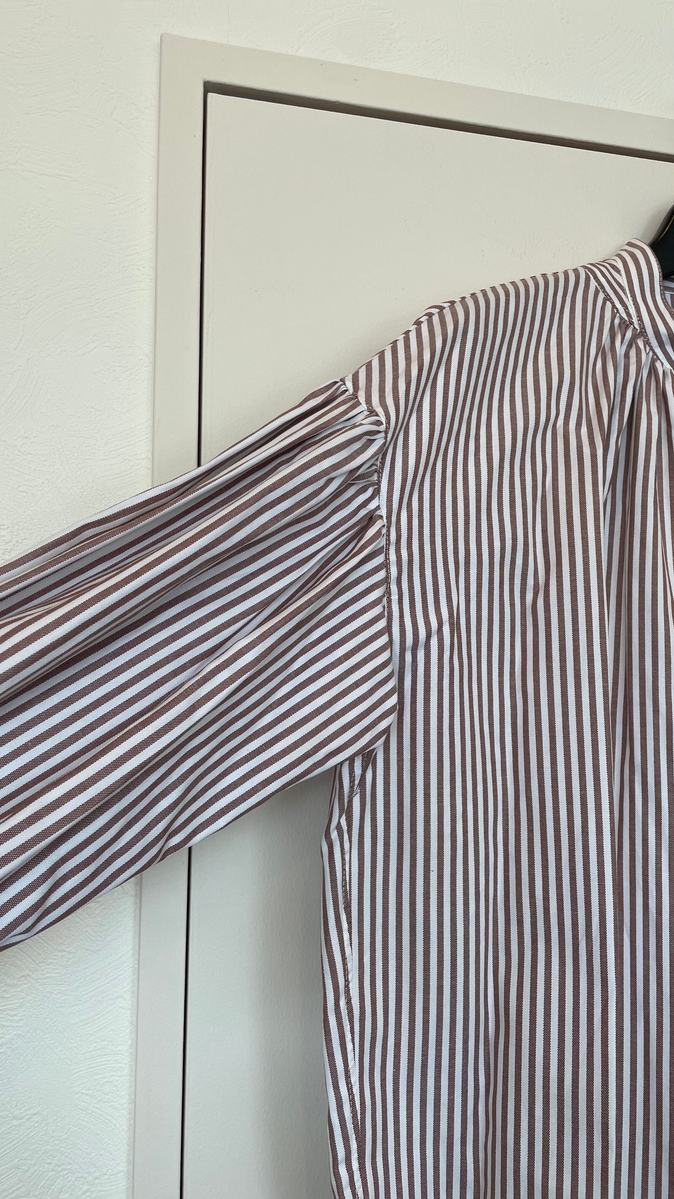 バンドカラーの襟周りや後ヨーク、袖口にたっぷりとギャザーが寄せられ、立体的なシルエットと柔らかな膨らみが特徴です。カジュアルなパンツからフェミニンなスカートまで幅広いコーディネートに対応できます。