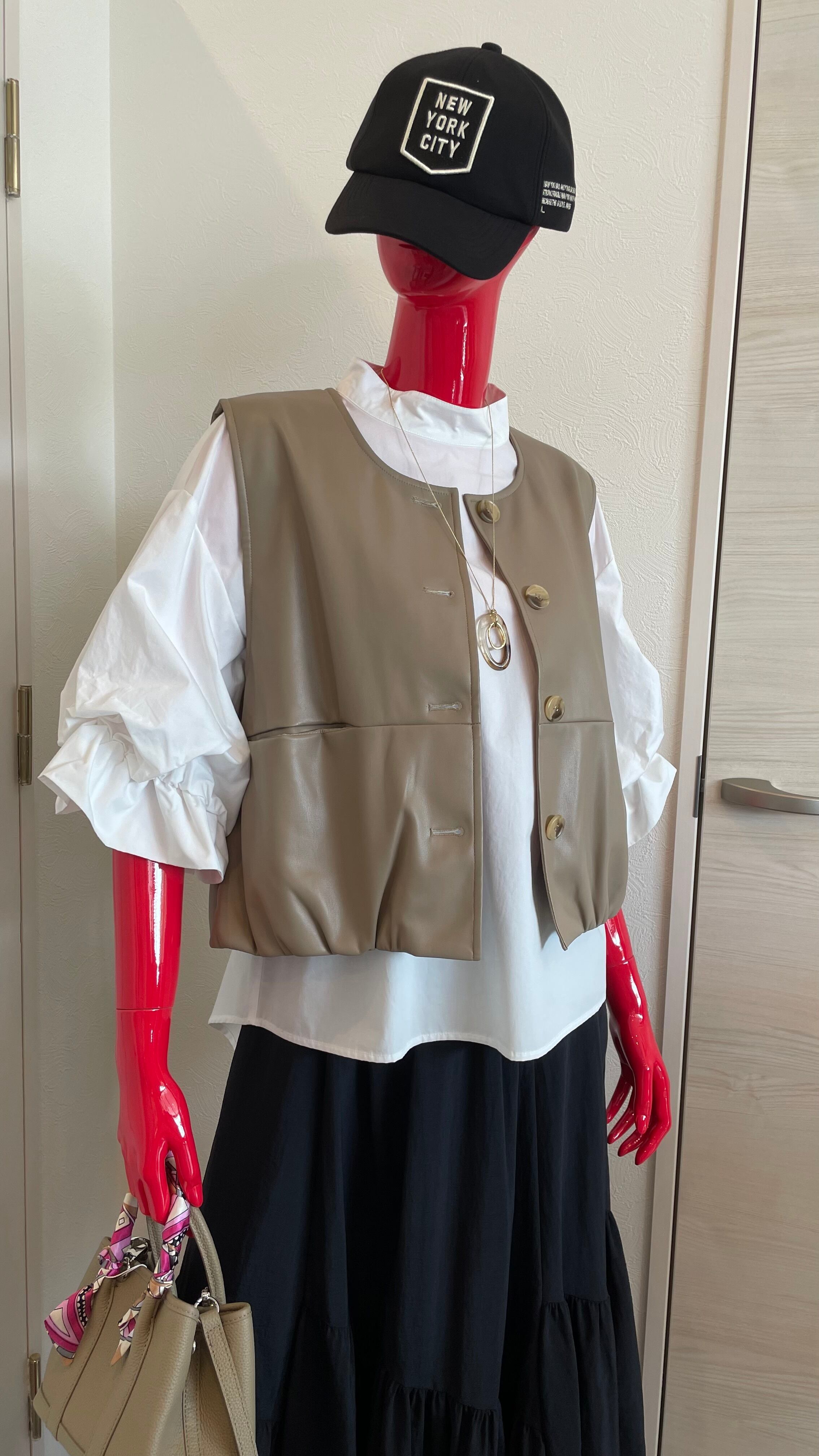 裾がシャーリングのフェイクレザーベストです♪ 季節感溢れるフェイクレザー素材を使用し、裾のシャーリングデザインが女性らしいシルエットを引き立てます。カジュアルにもフォーマルにも合わせやすく、様々なスタイルにマッチします◎