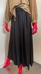 ウエスト部分に施されたタックがお腹まわりをカバーし、上品で洗練された印象を与え、内側のリボンで調節が可能です。さまざまなトップスと組み合わせておしゃれを楽しめます!