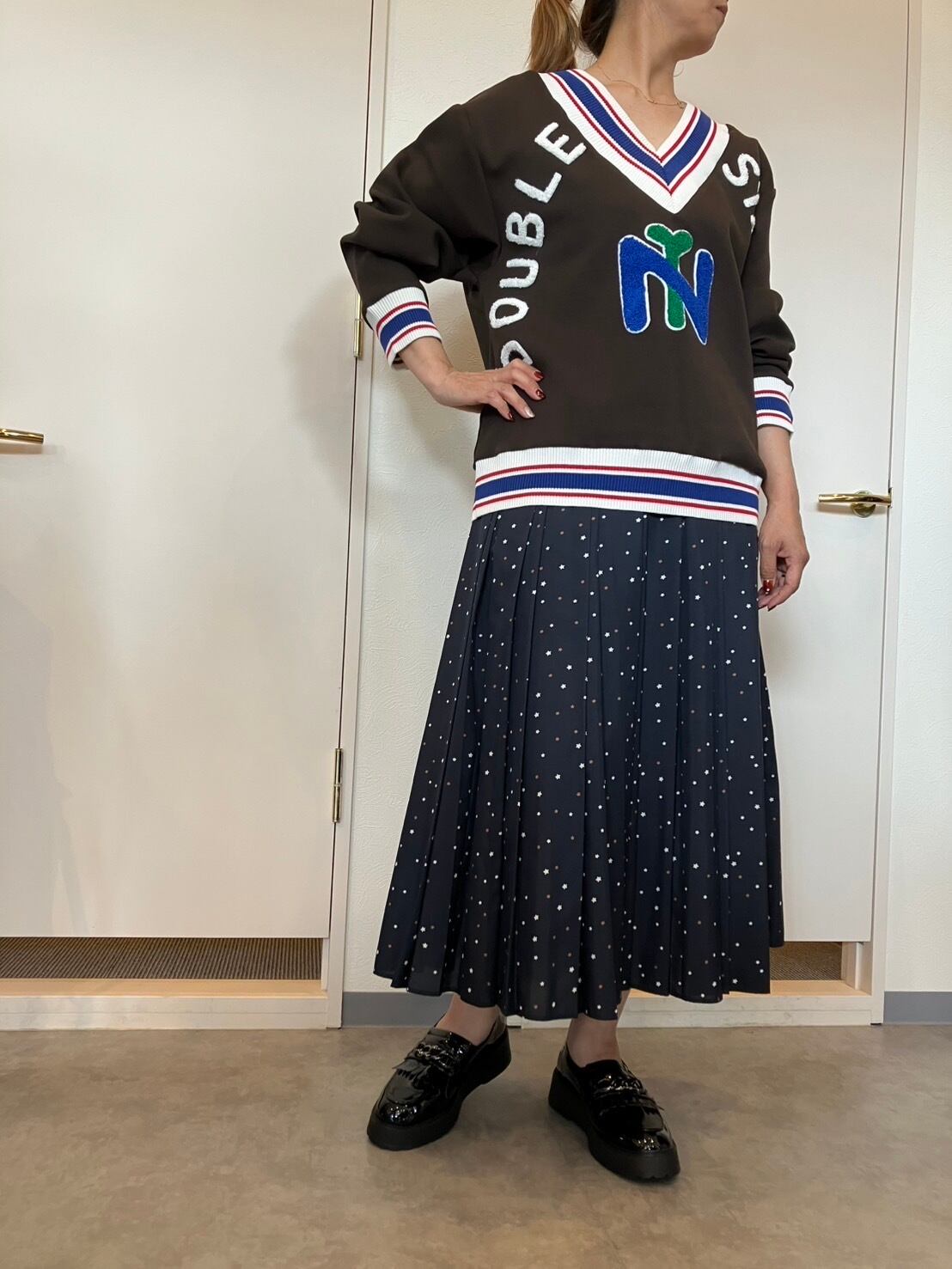 小さな星柄がプリントされていますが、遠くから見たらドット柄にも見えるスカートです。