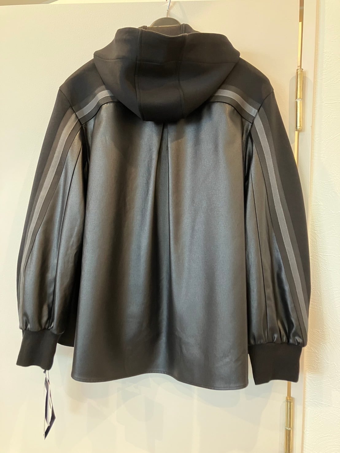 腕から背中にラインが入り、スポーティな印象ですが、エコレザー調と緩和され大人ブルゾンです。