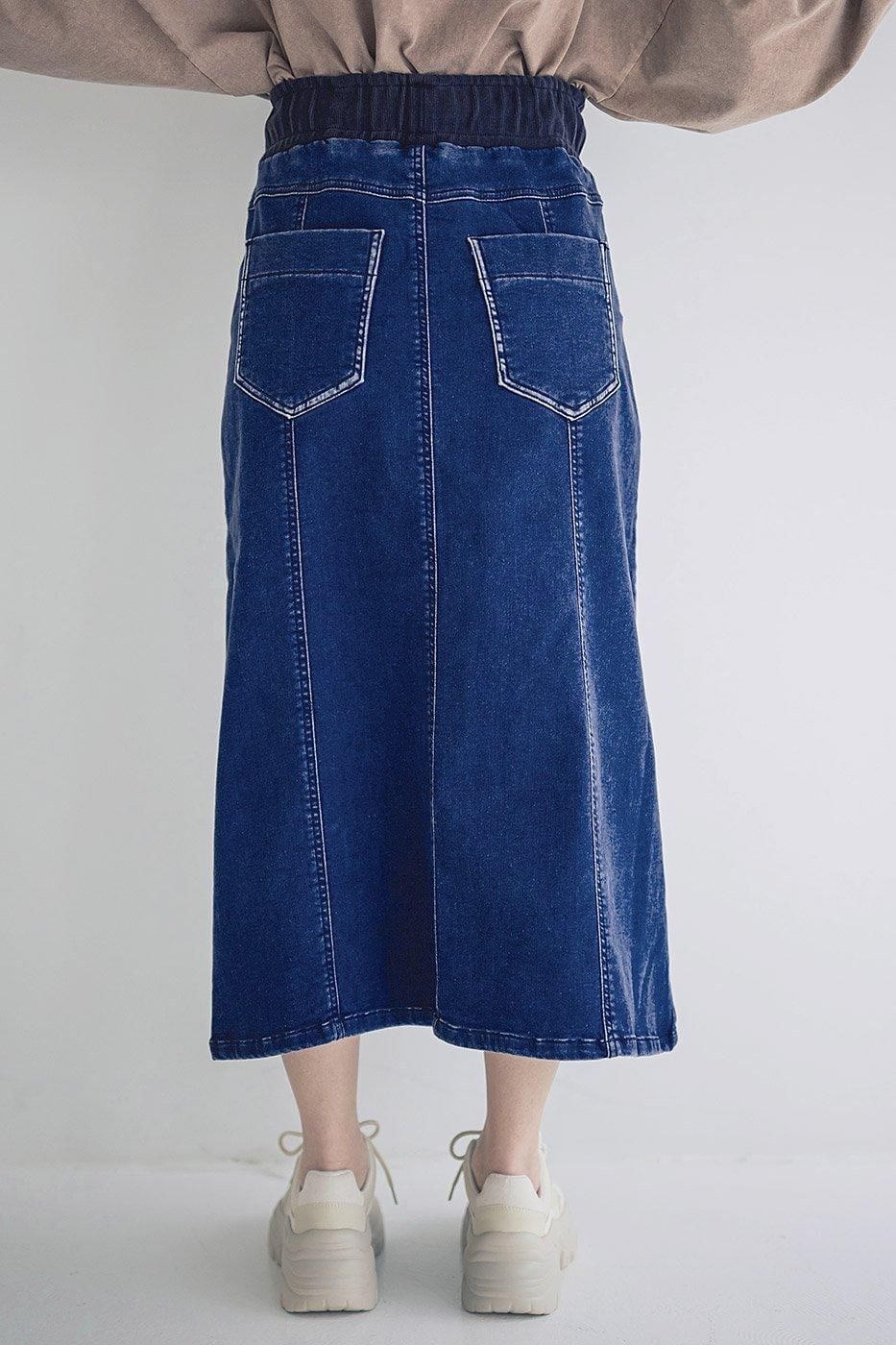フロントの約17cmスリットで足さばきも良く、ウエストはリブ仕様なのでストレスフリーに着用できます。