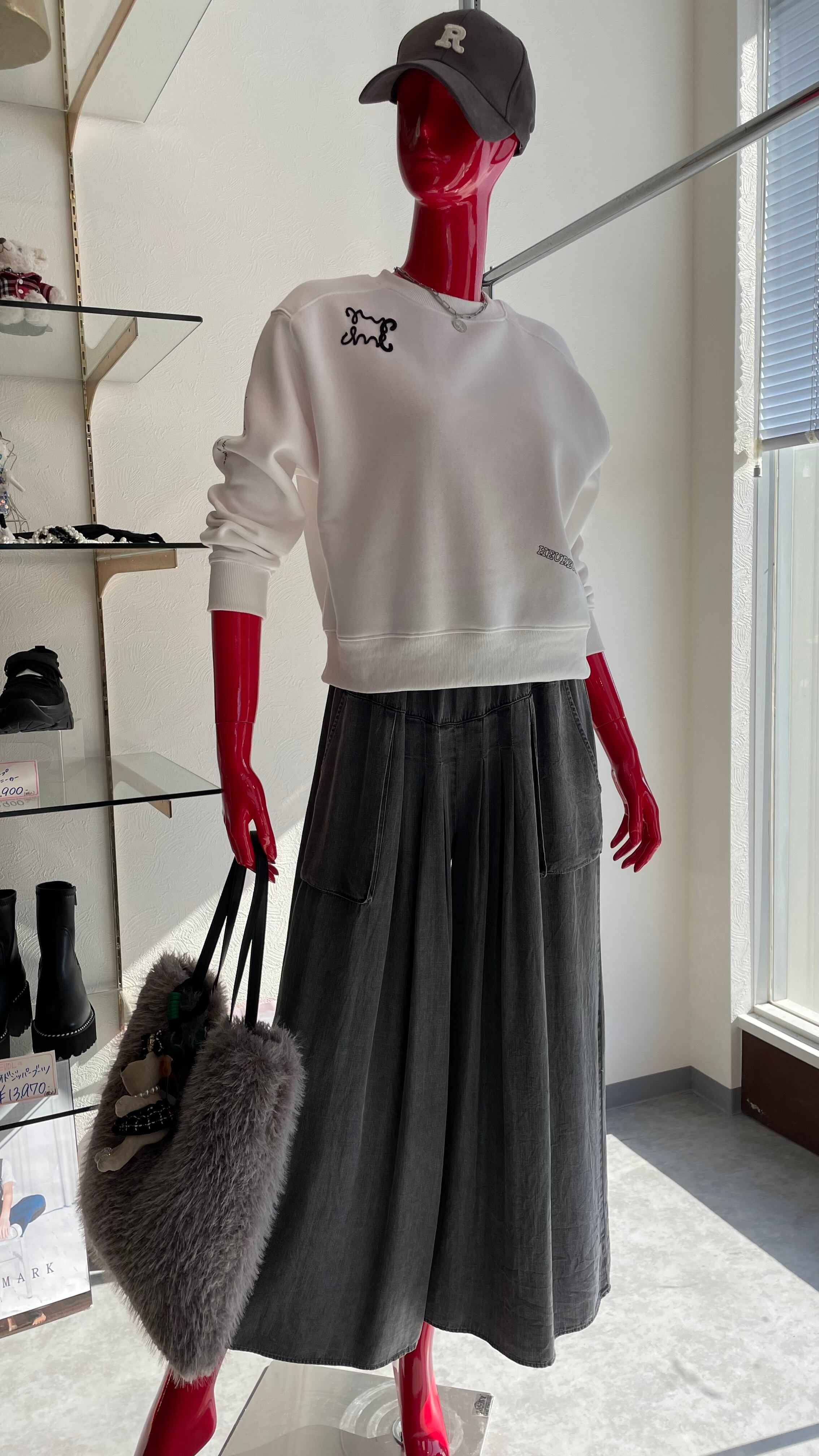 コンパクトなサイズ感なので、ワイドなパンツや、スカートとよく合います。