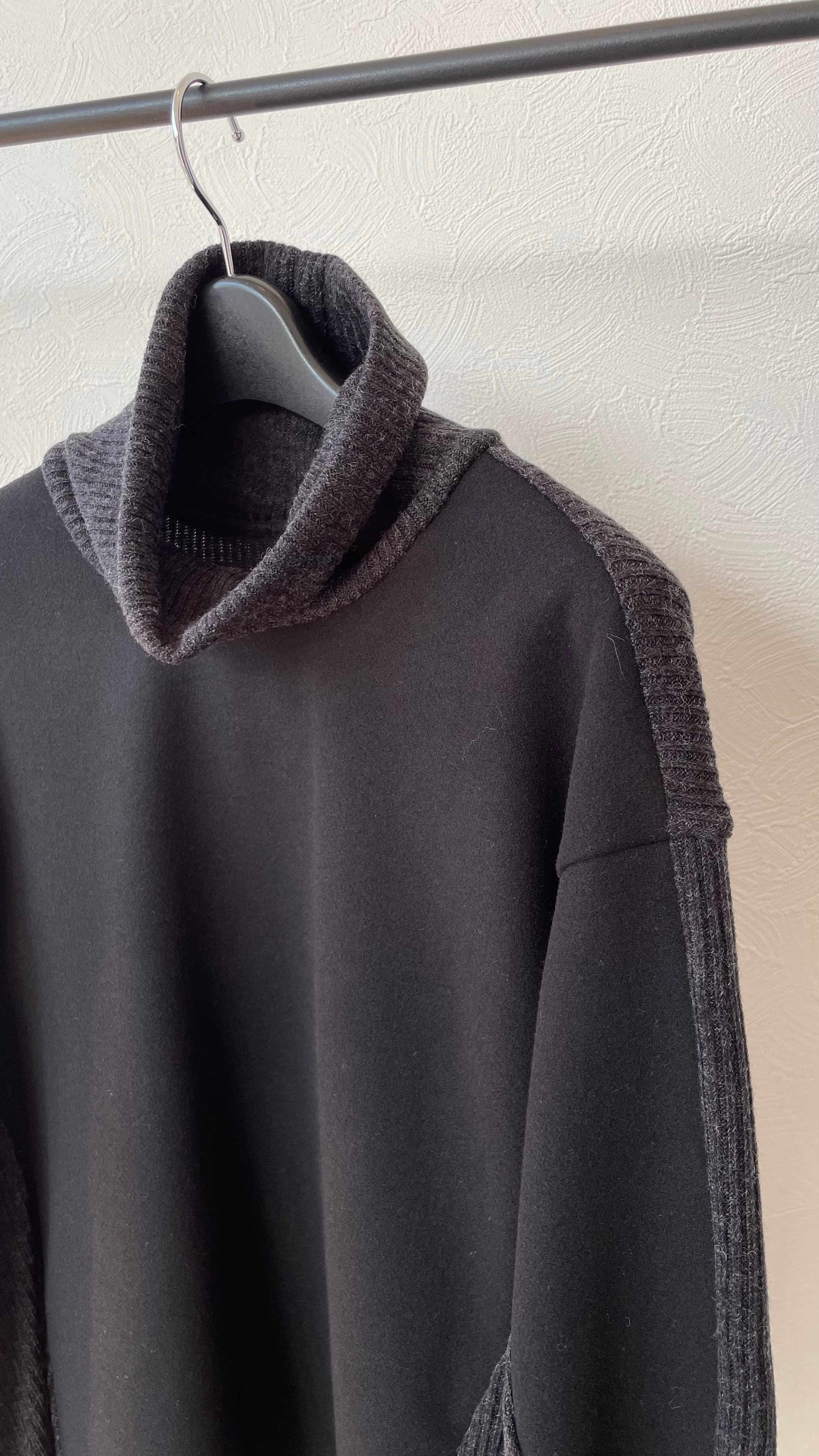 身頃はブラックで圧縮ニット素材で、タートル、袖先、サイド背中部分はチャコールグレーでニット素材になります。