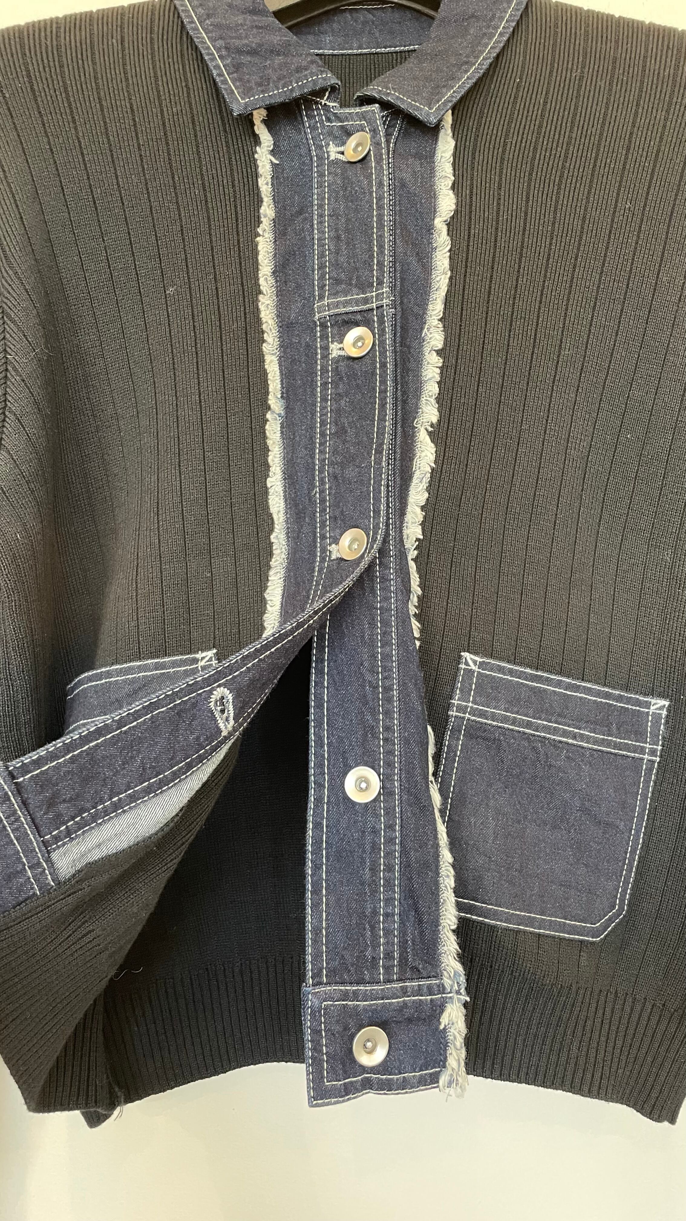 前タテ、襟元はデニムになり、柔らかなストレッチ性のニット素材を取り入れたデザインが特徴◎