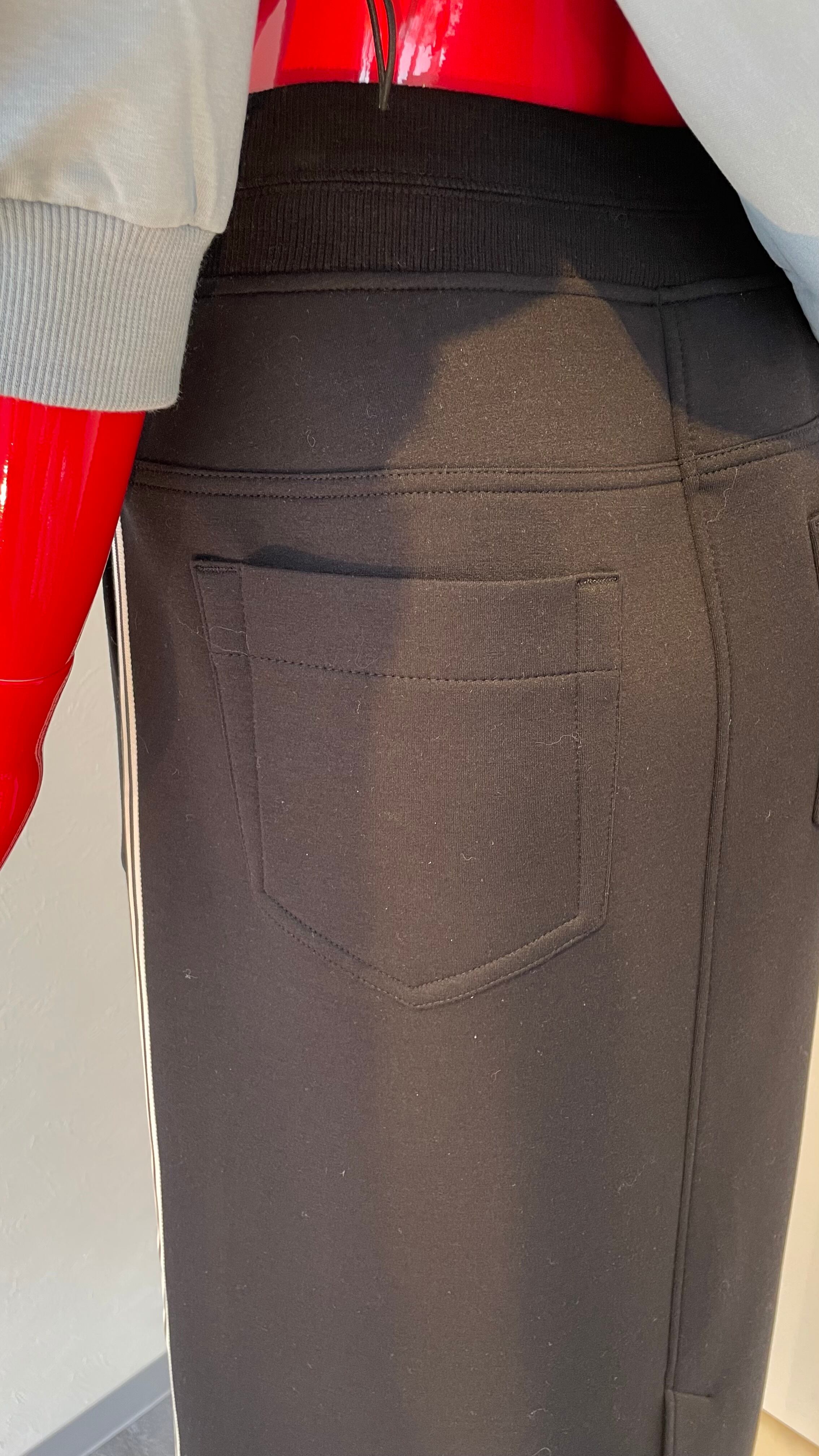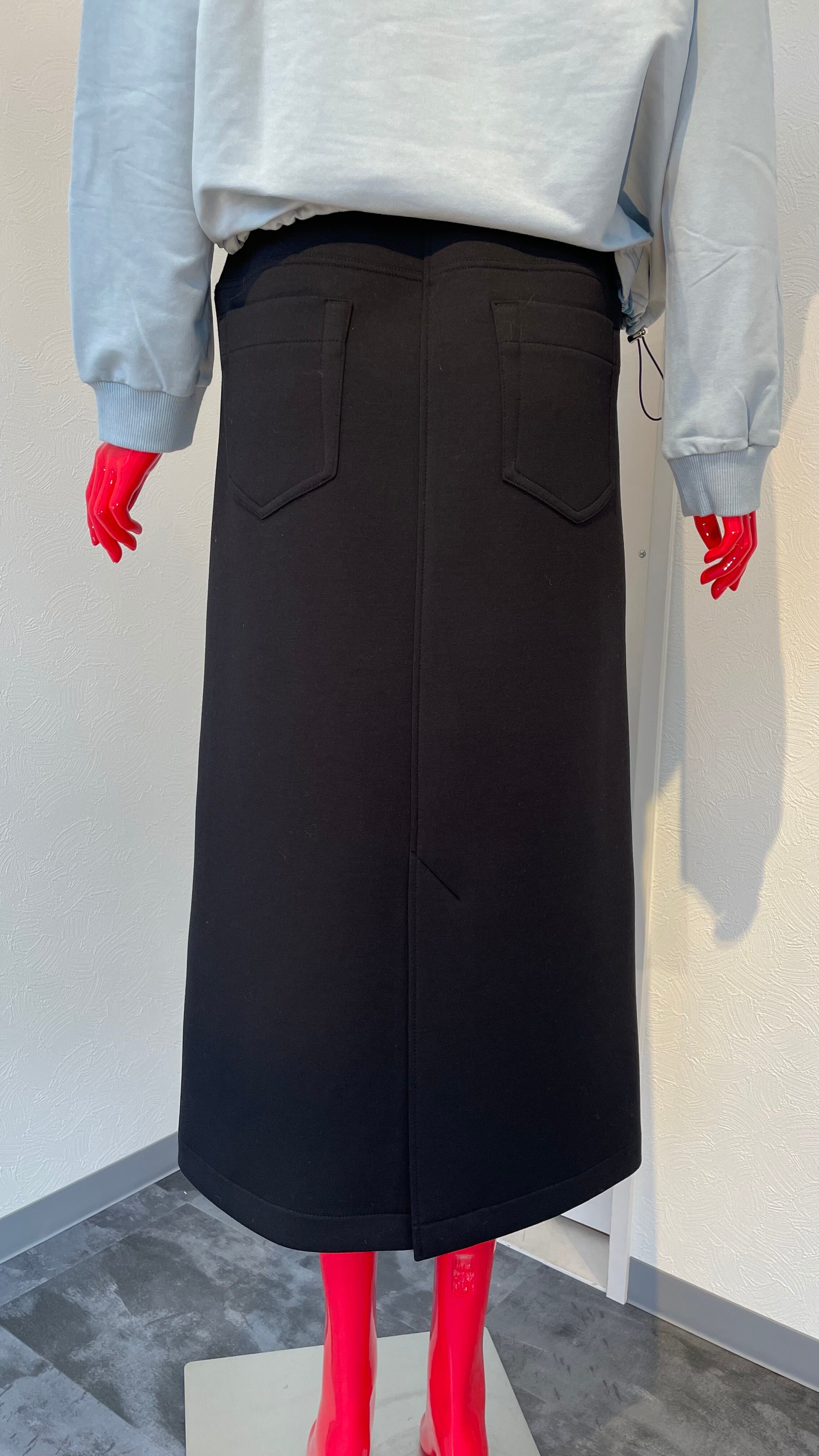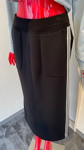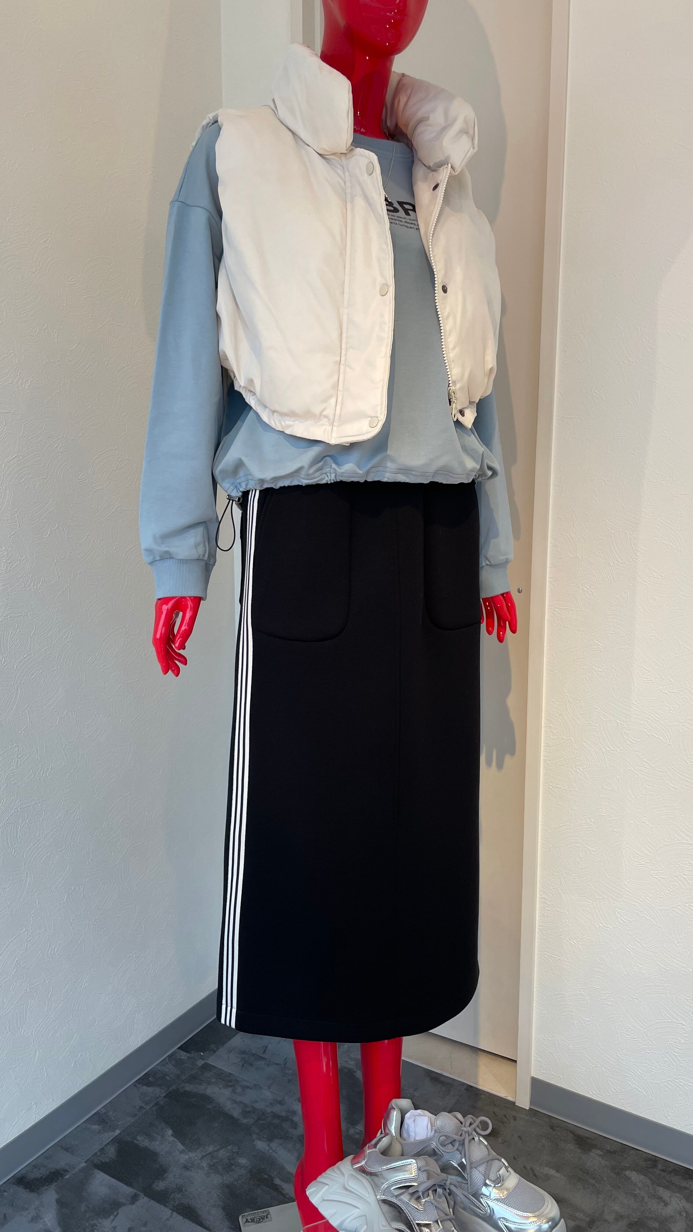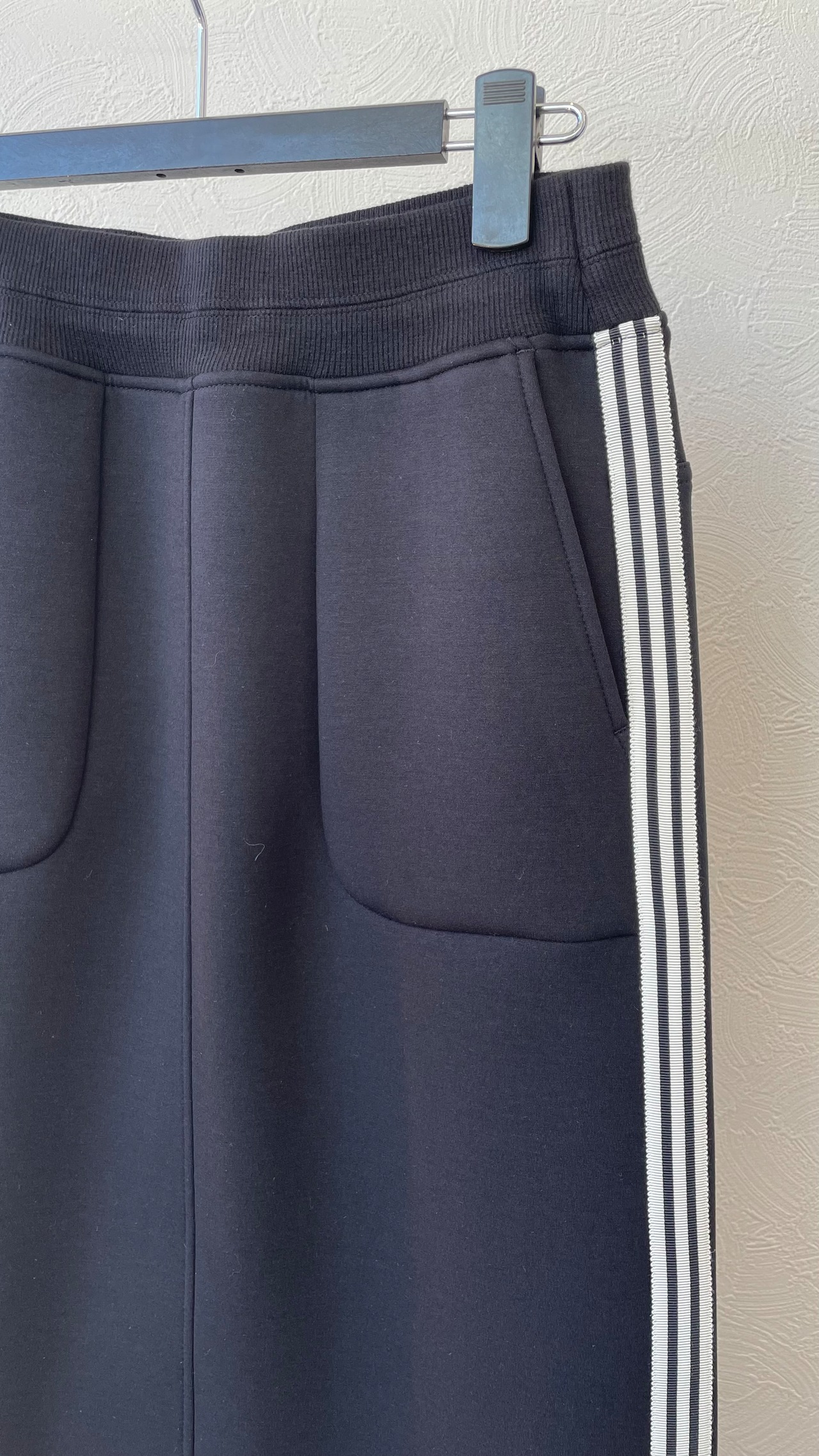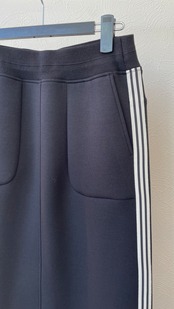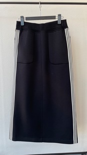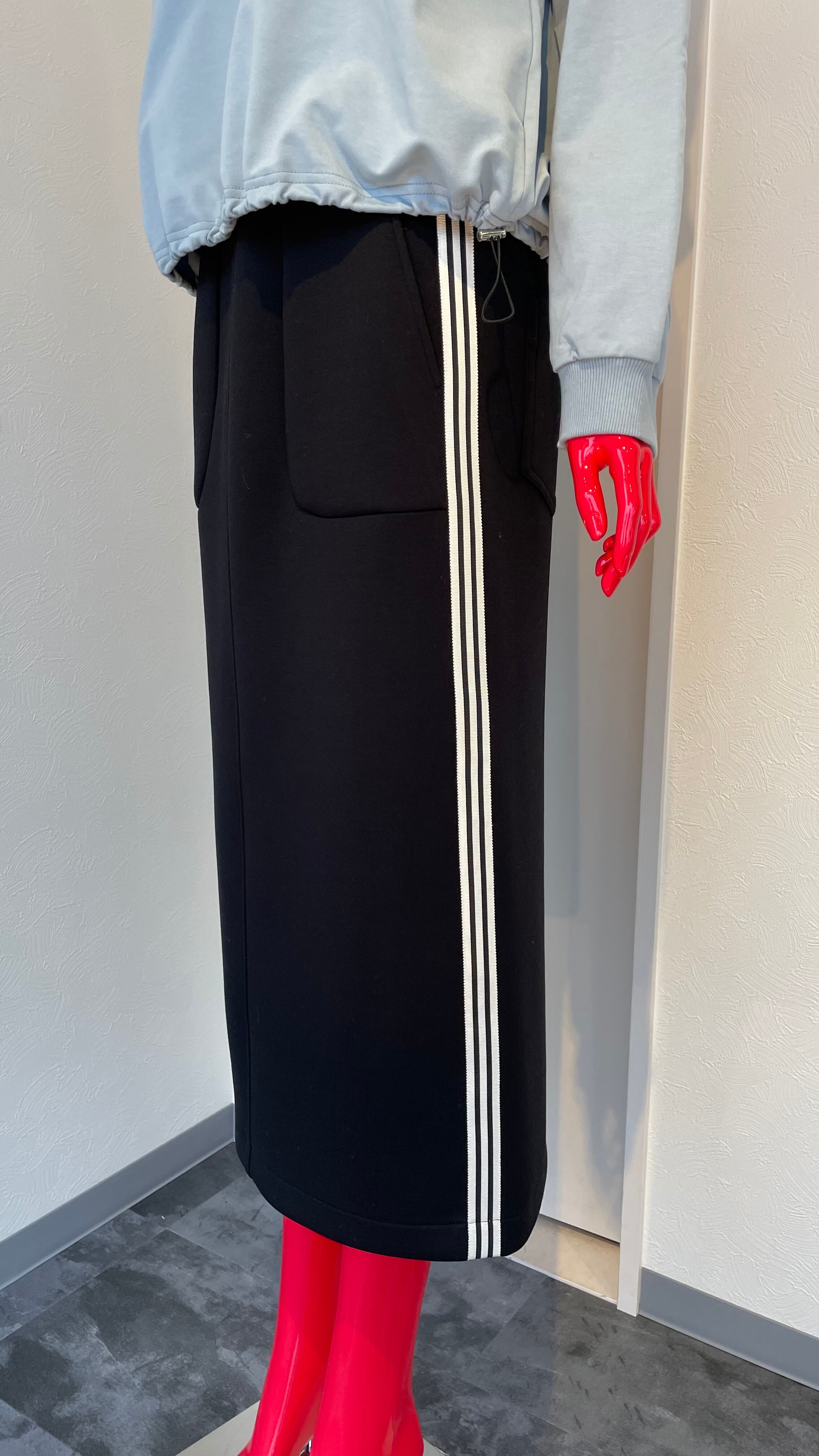 横脇にグログランテープの黒と白のストライプのサイドラインが入り、縦の視覚効果で細見えするスカートです◎