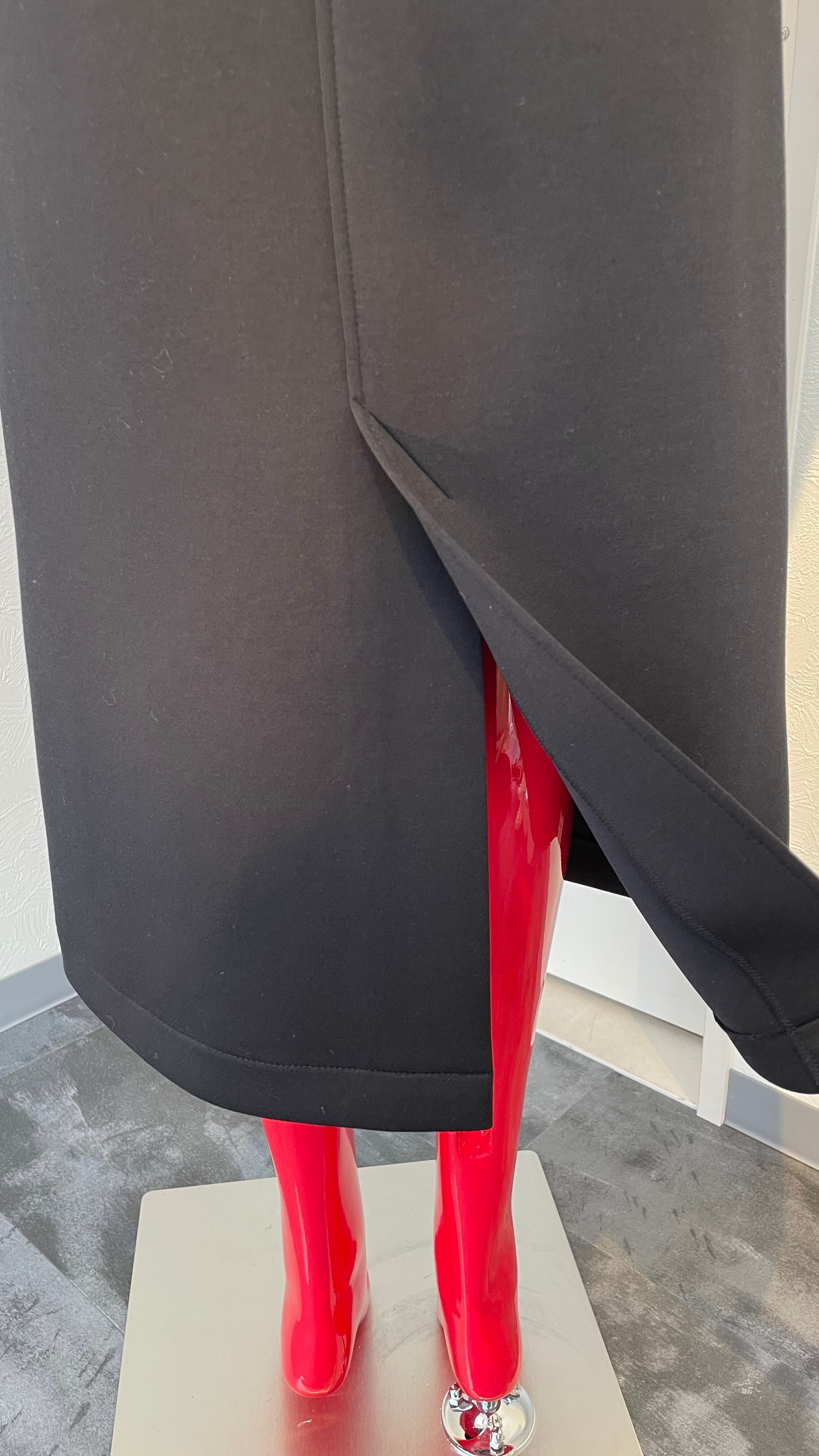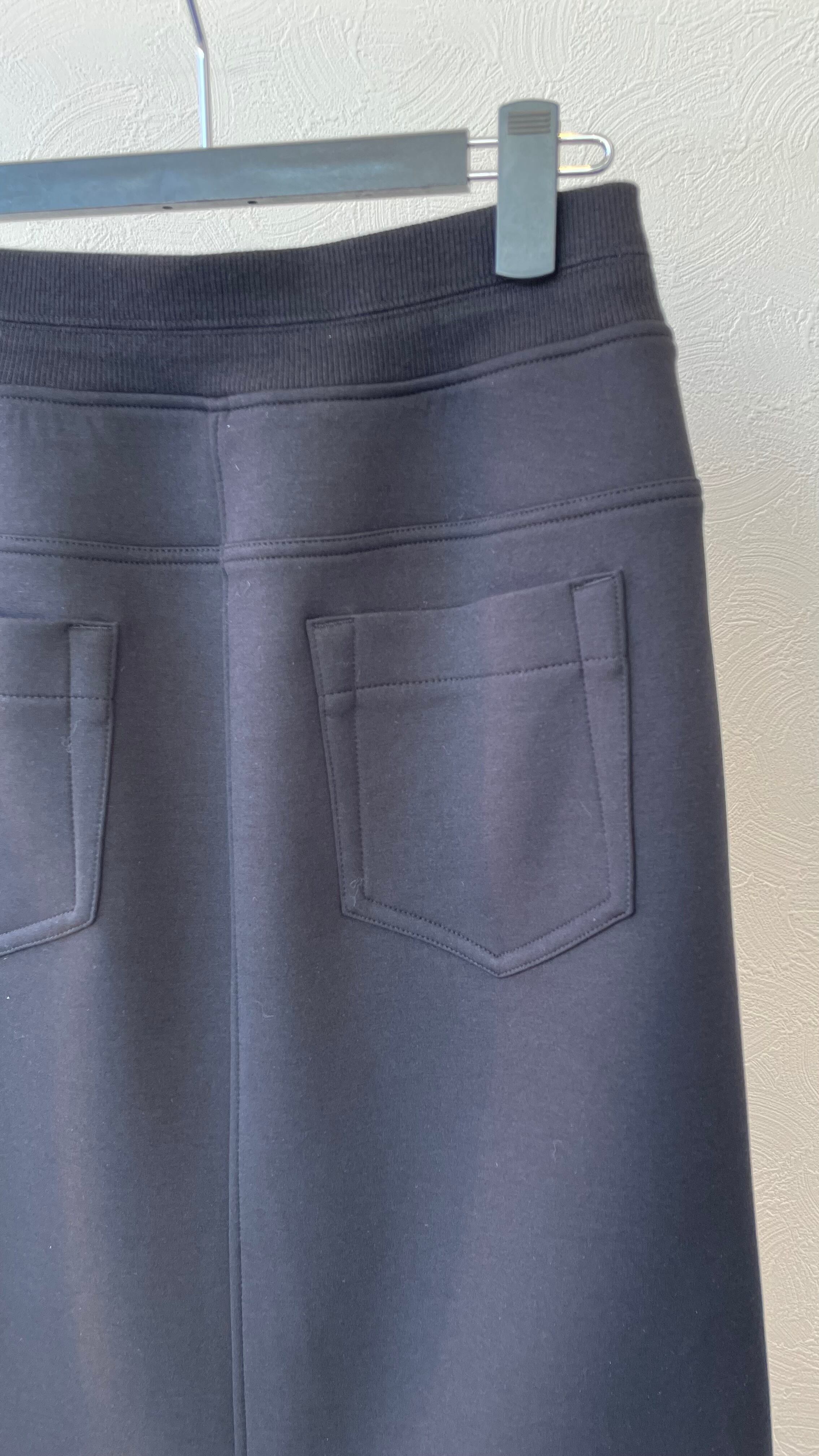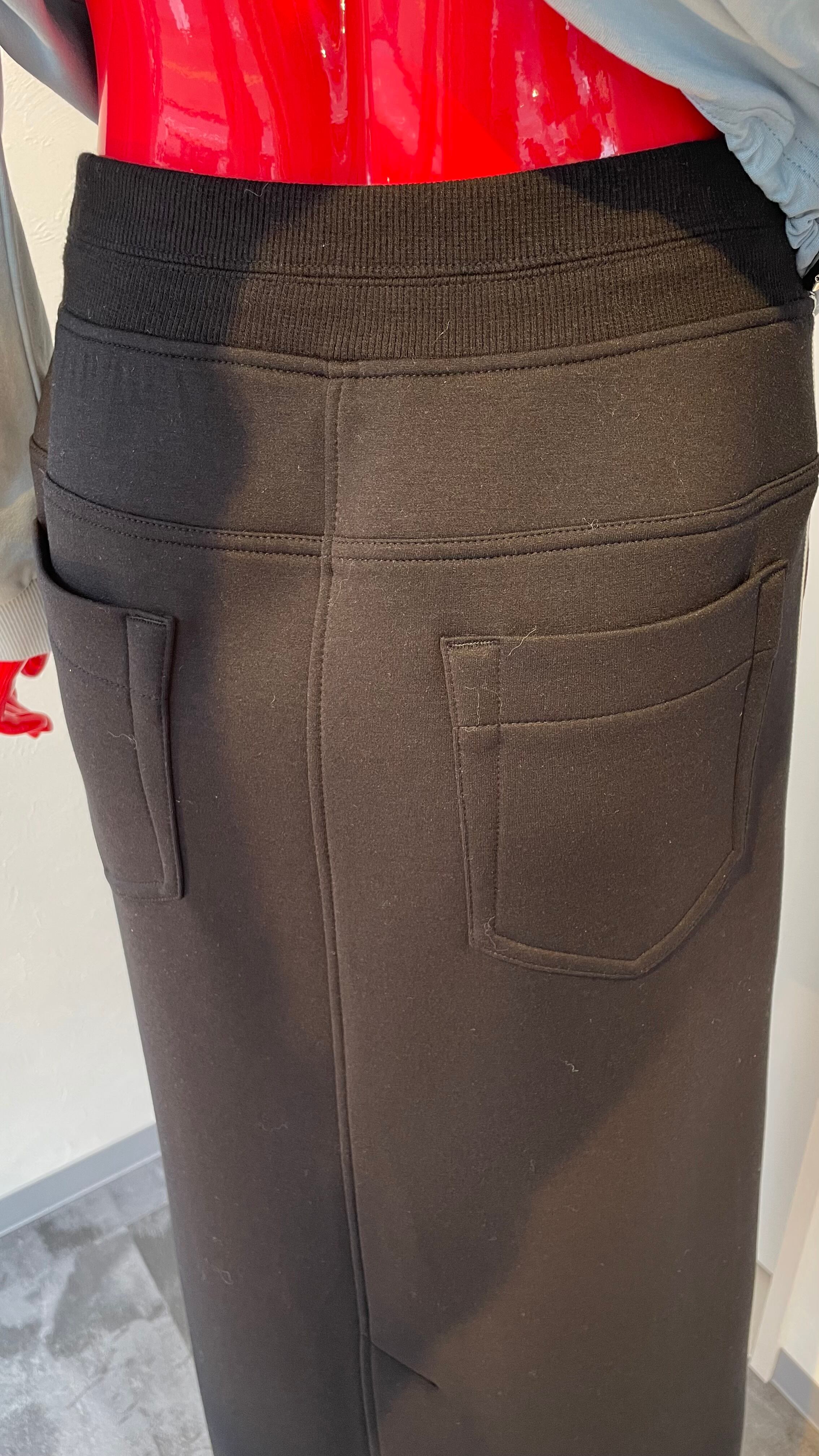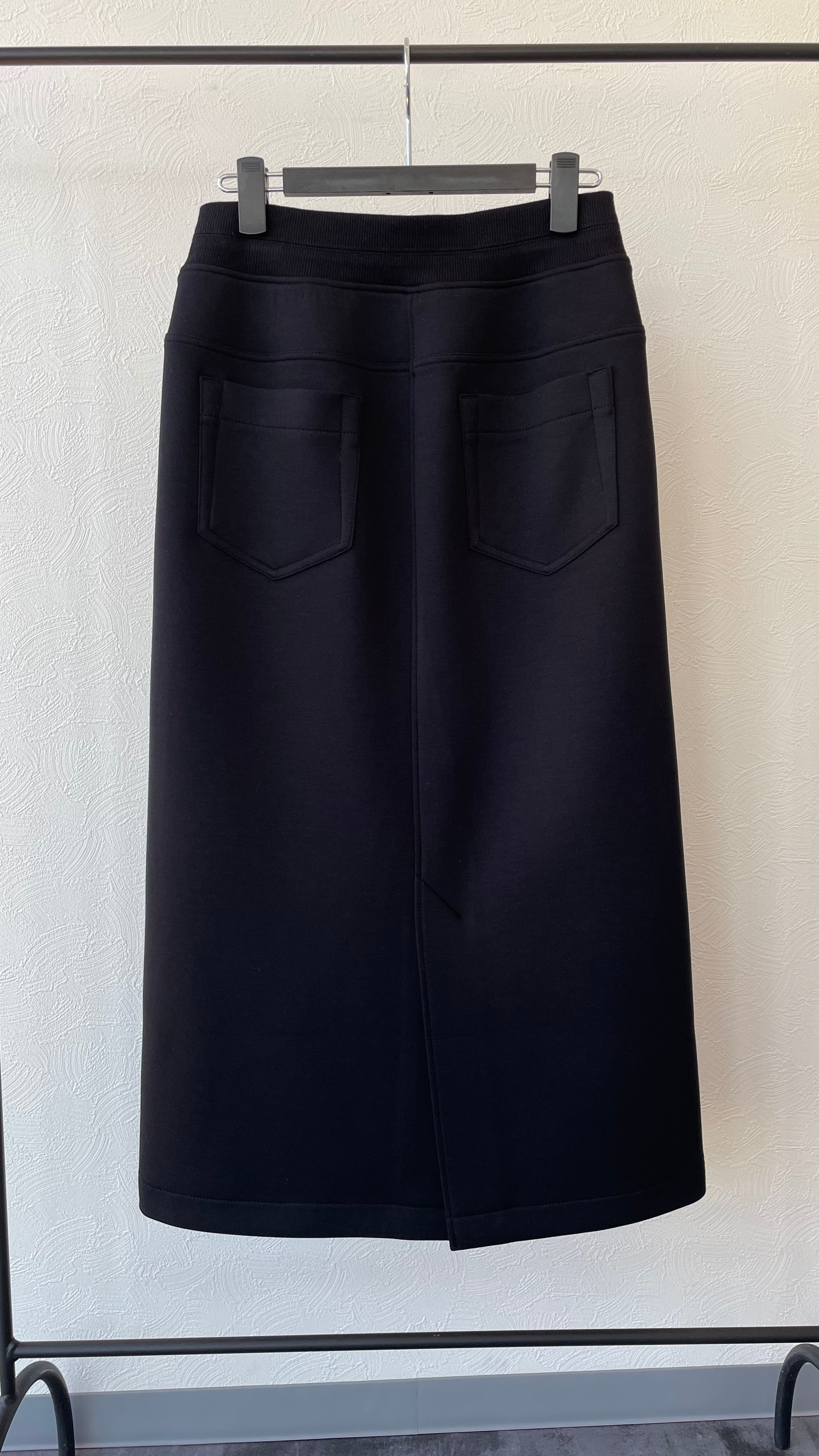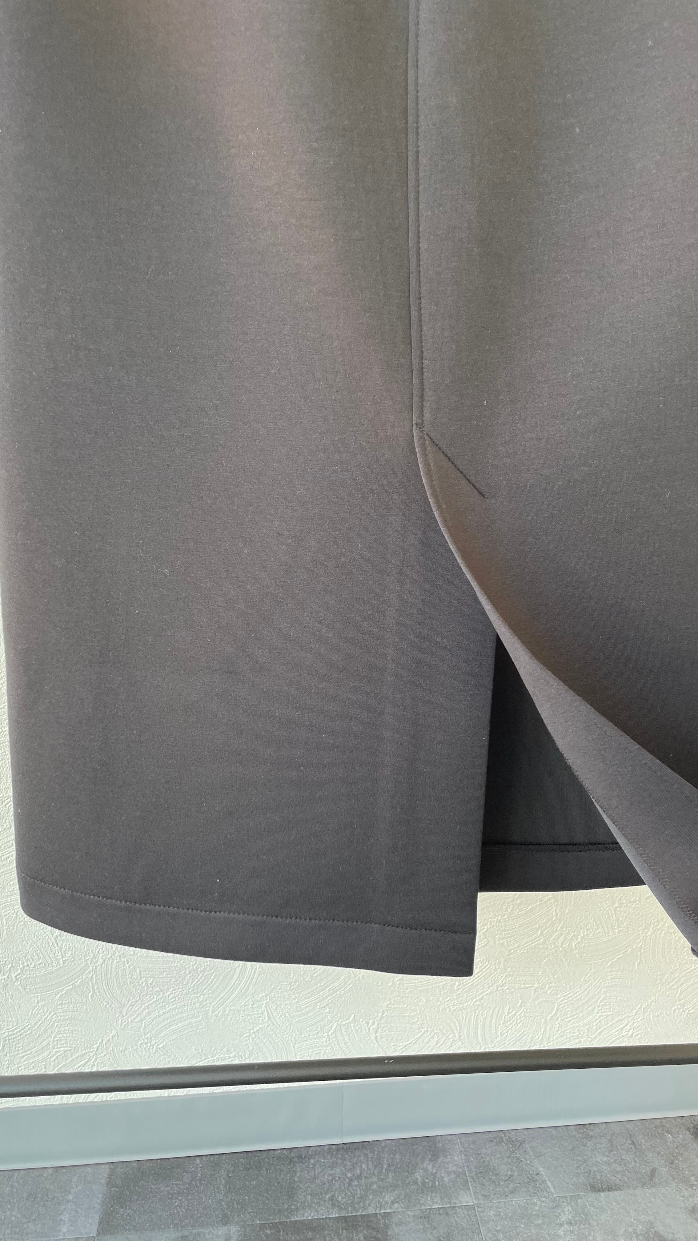 横脇にグログランテープの黒と白のストライプのサイドラインが入り、縦の視覚効果で細見えするスカートです◎