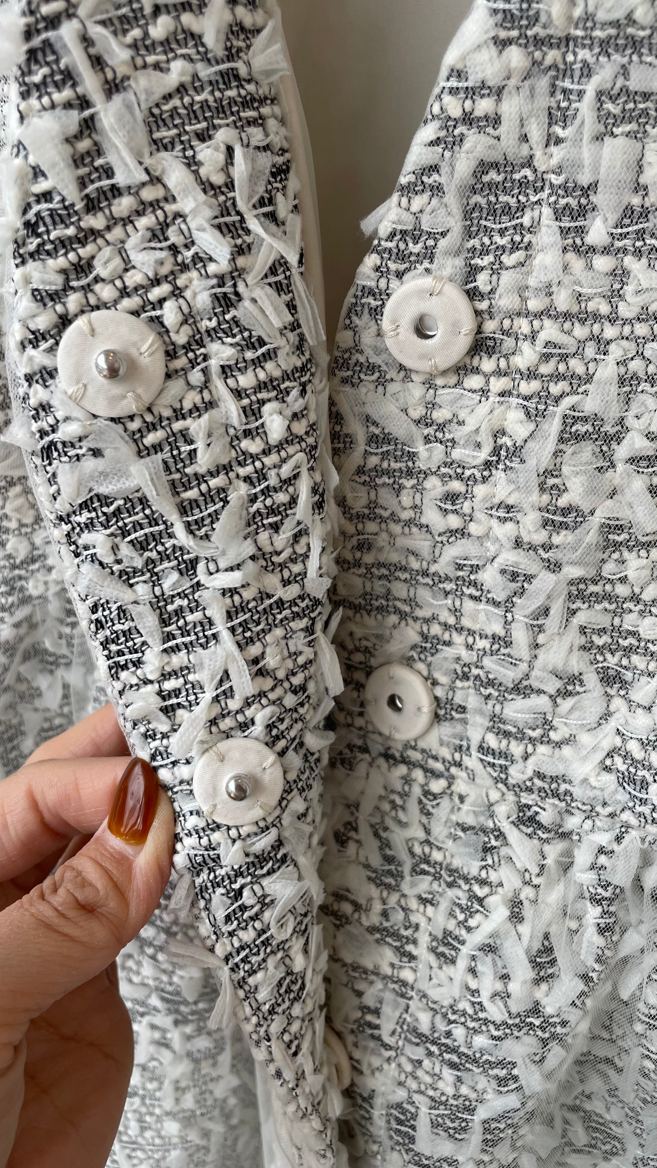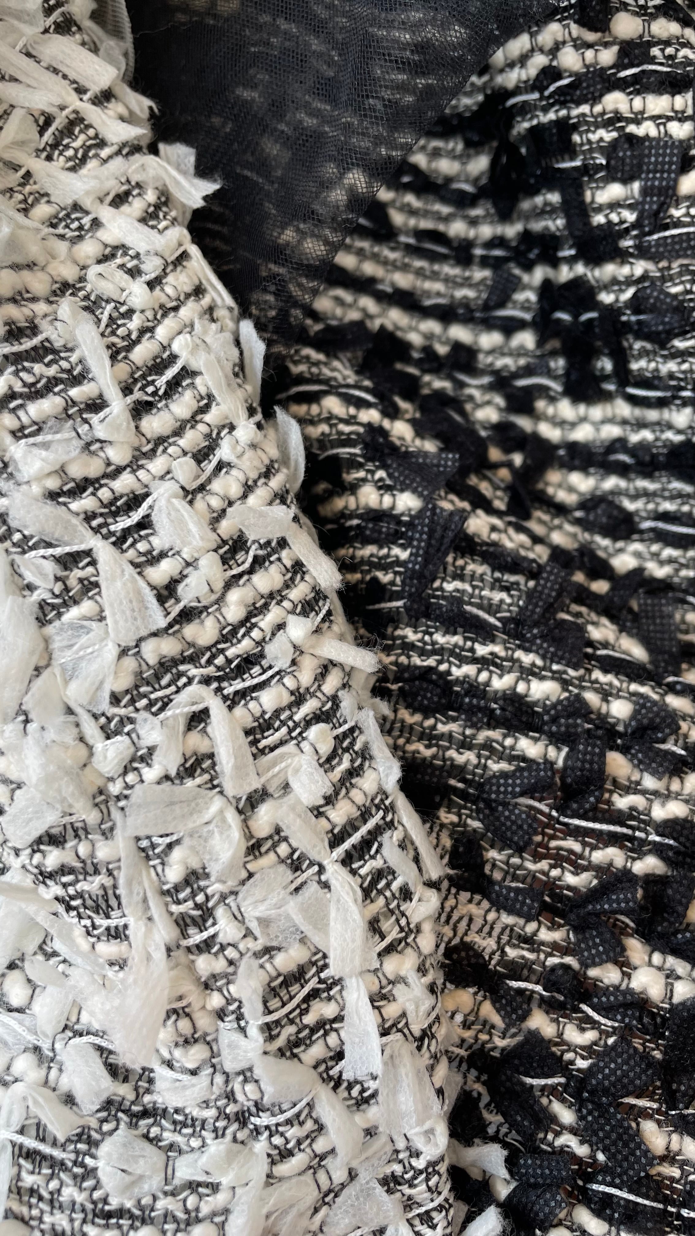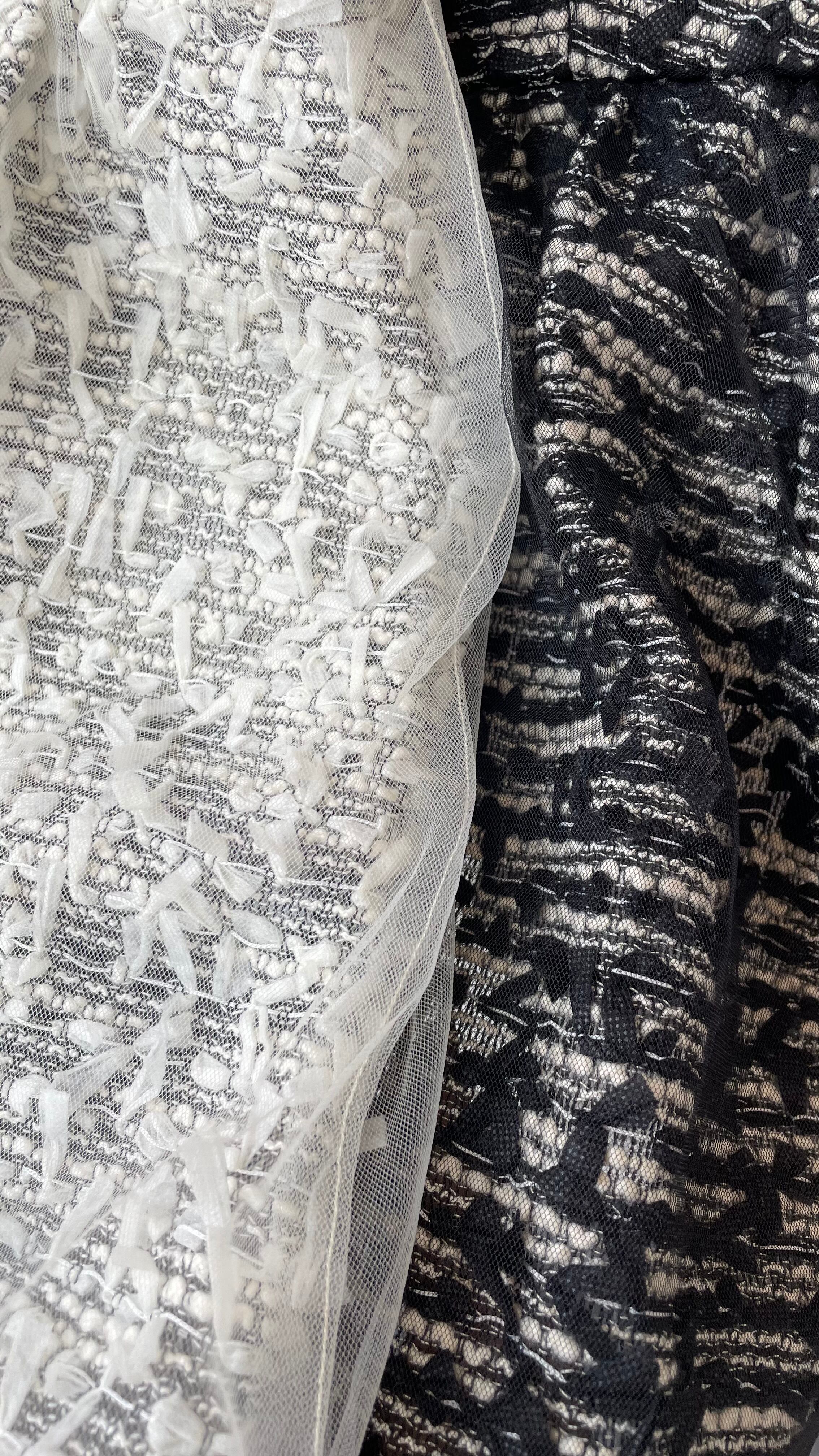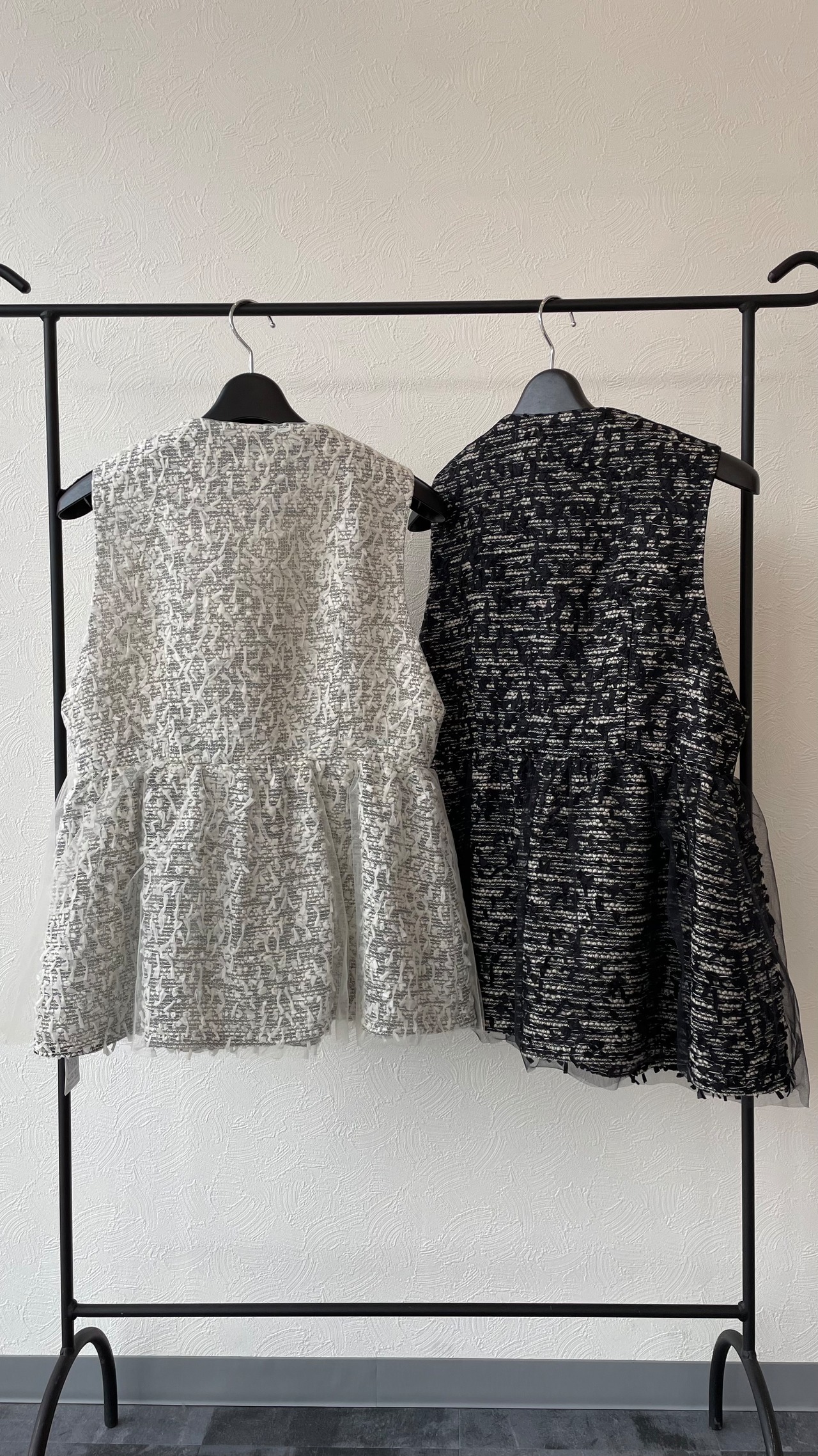 数種類の糸をミックスして、立体感のあるツイードをベースに、その上にチュールを重ねることで、異素材ならではの奥行きと新鮮な表情を楽しめるアイテムです◎