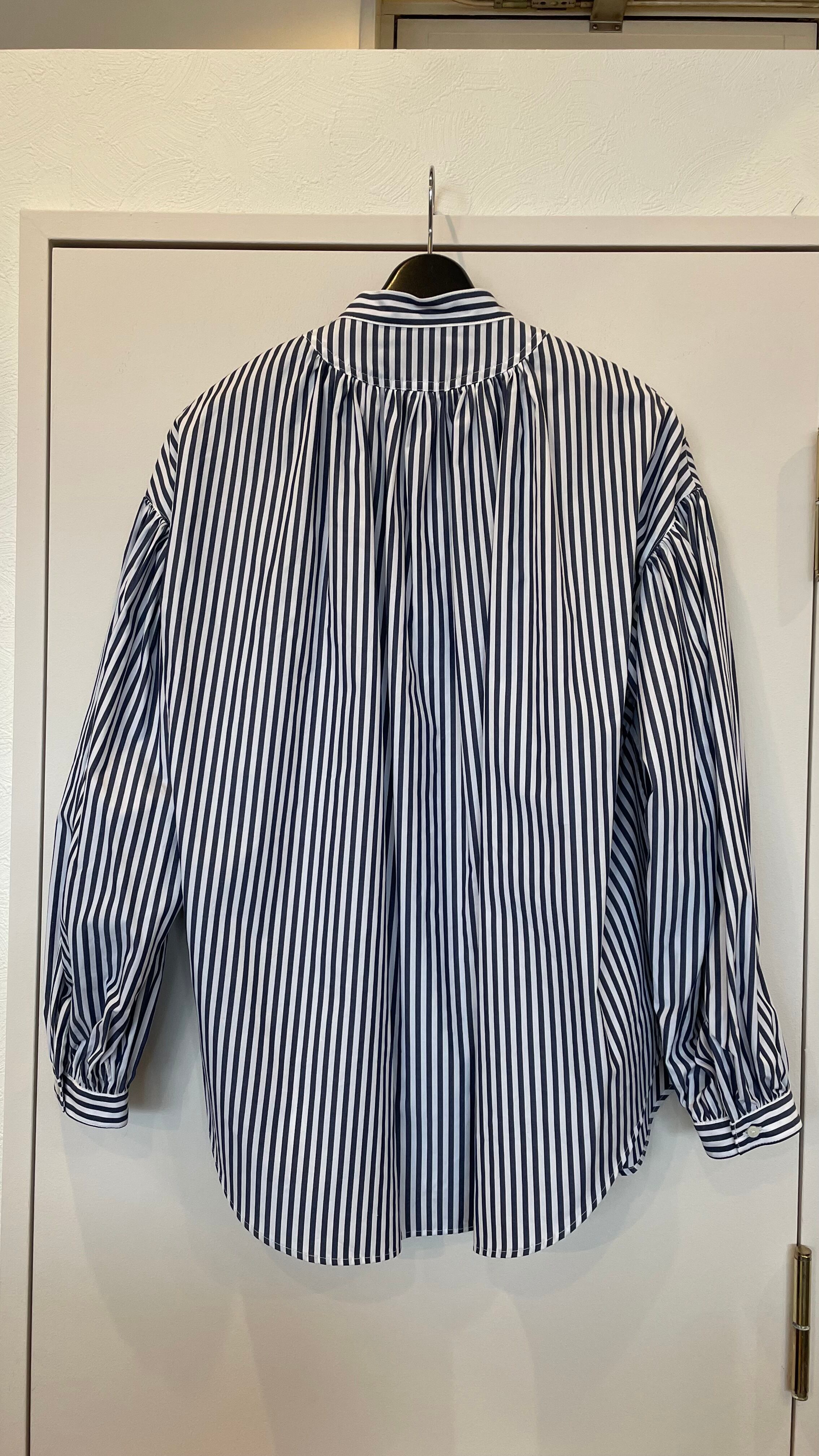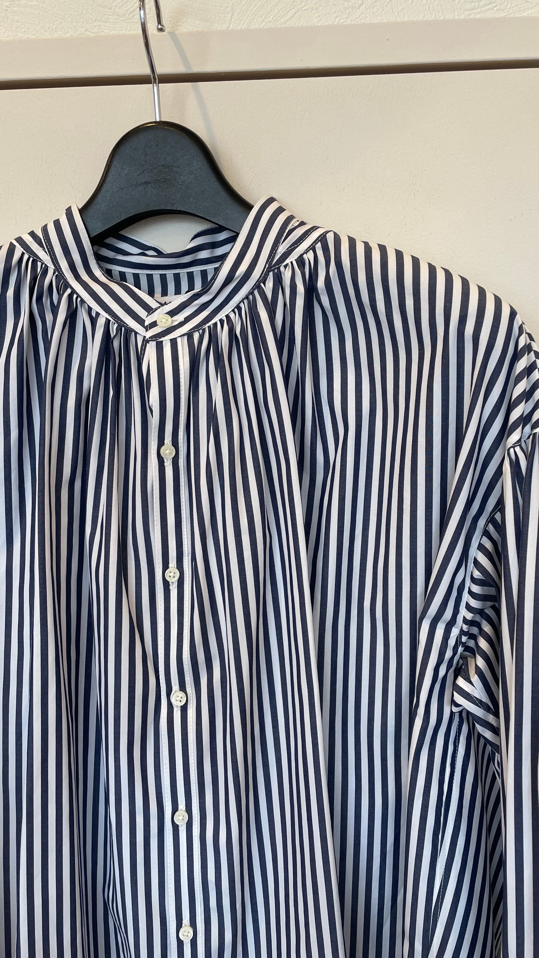 衿はバンドカラーで肩を落とし、衿周りから後ヨーク、袖口にたっぷりとギャザーを入れた柔らかな膨らみのあるMANON定番のアミカルシャツです。