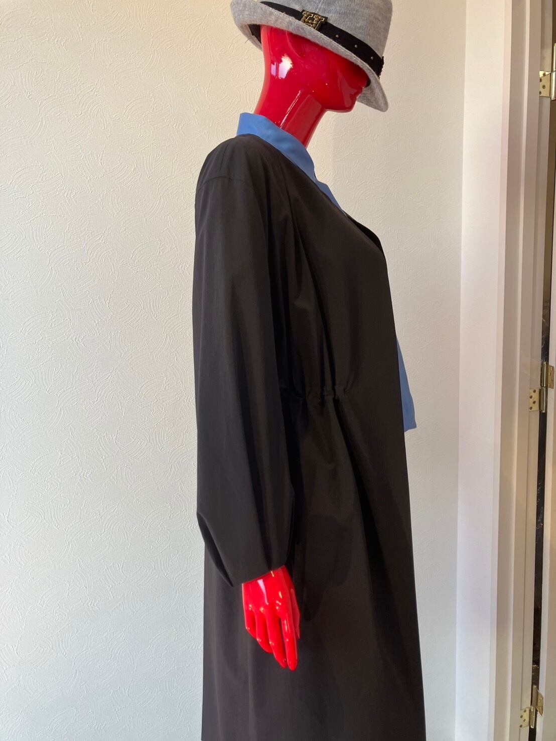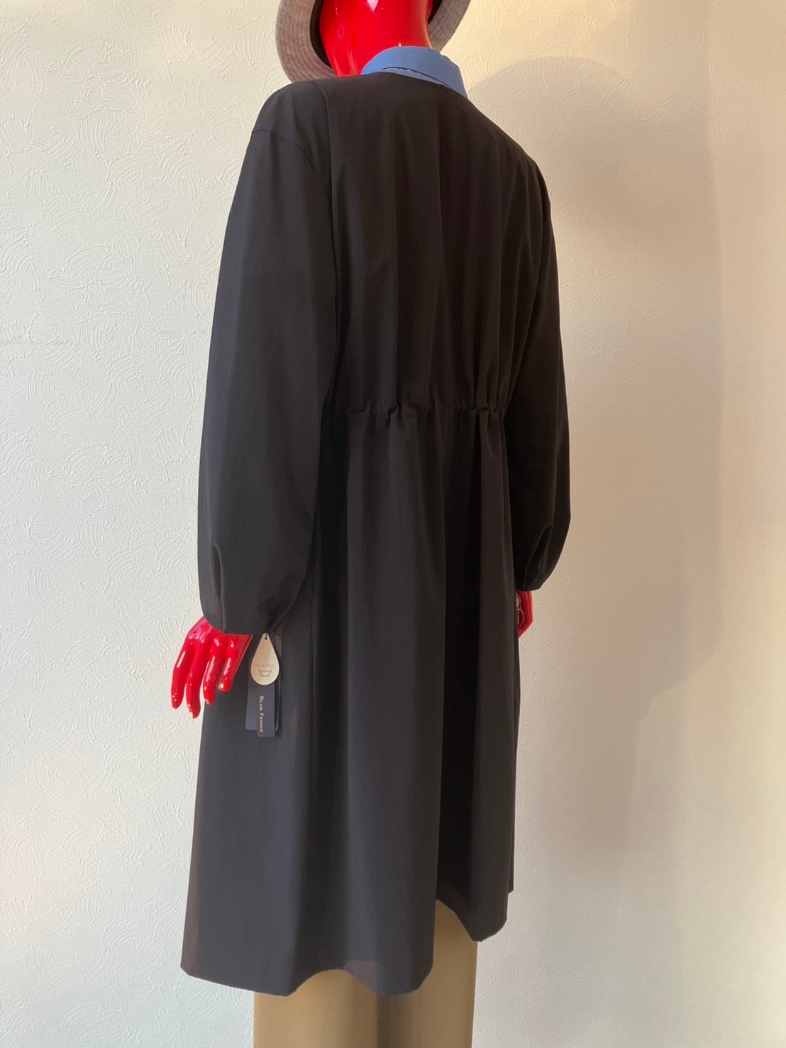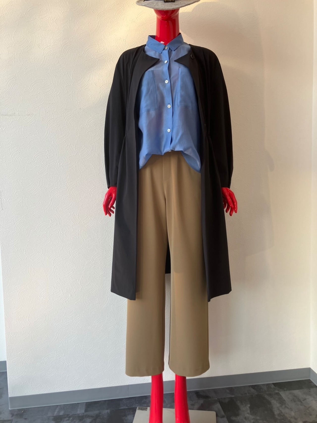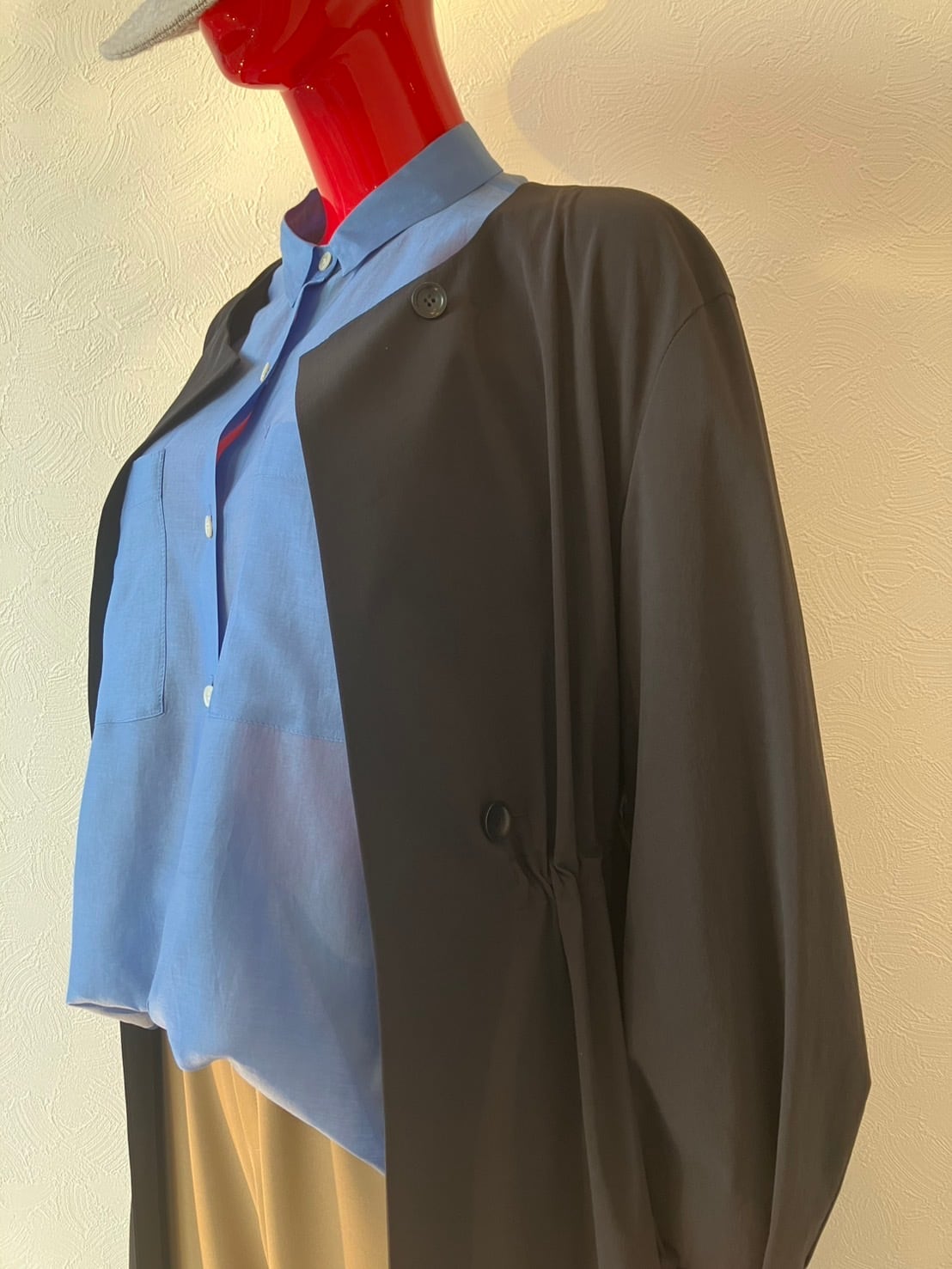 ノーカラーのスッキリとした襟元で、若干のハリ感と落ち感があり、とても綺麗なラインです。