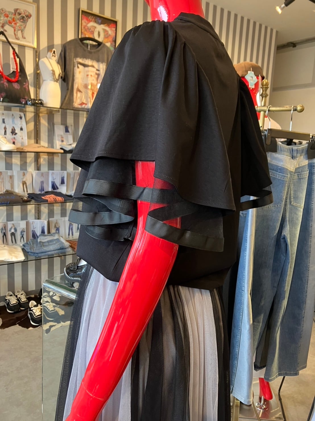 お袖のフレアは2重になっており、下の部分はチュールで、その袖先は黒のテープリボンが、ぐるりと付きます。
