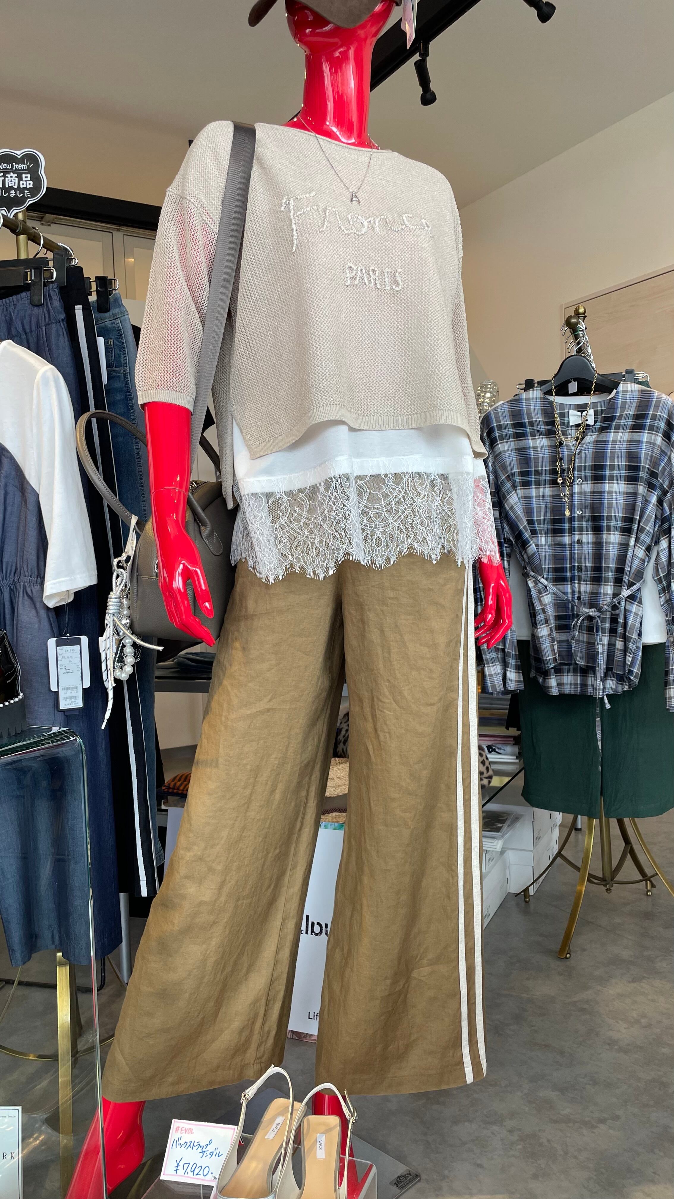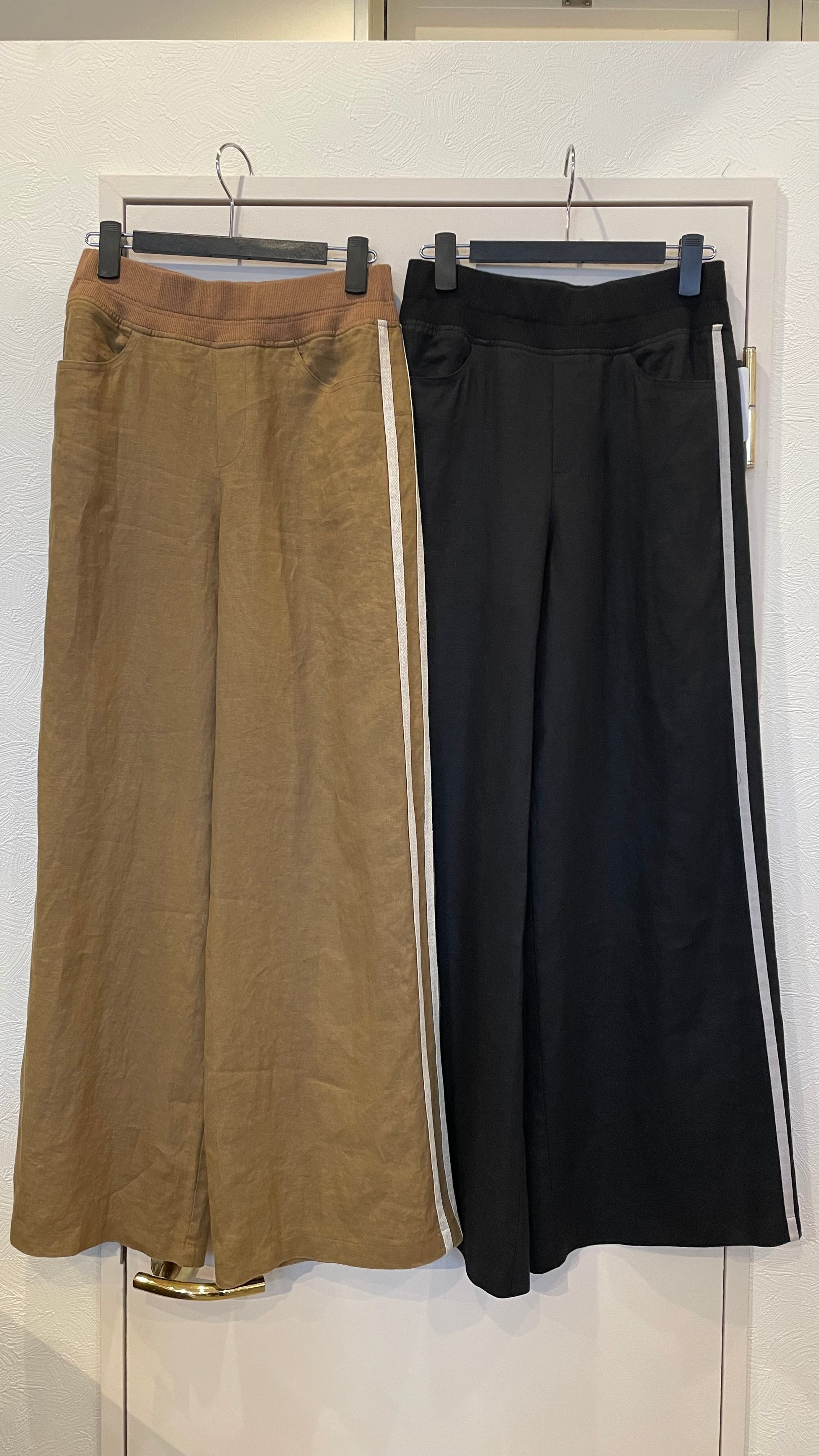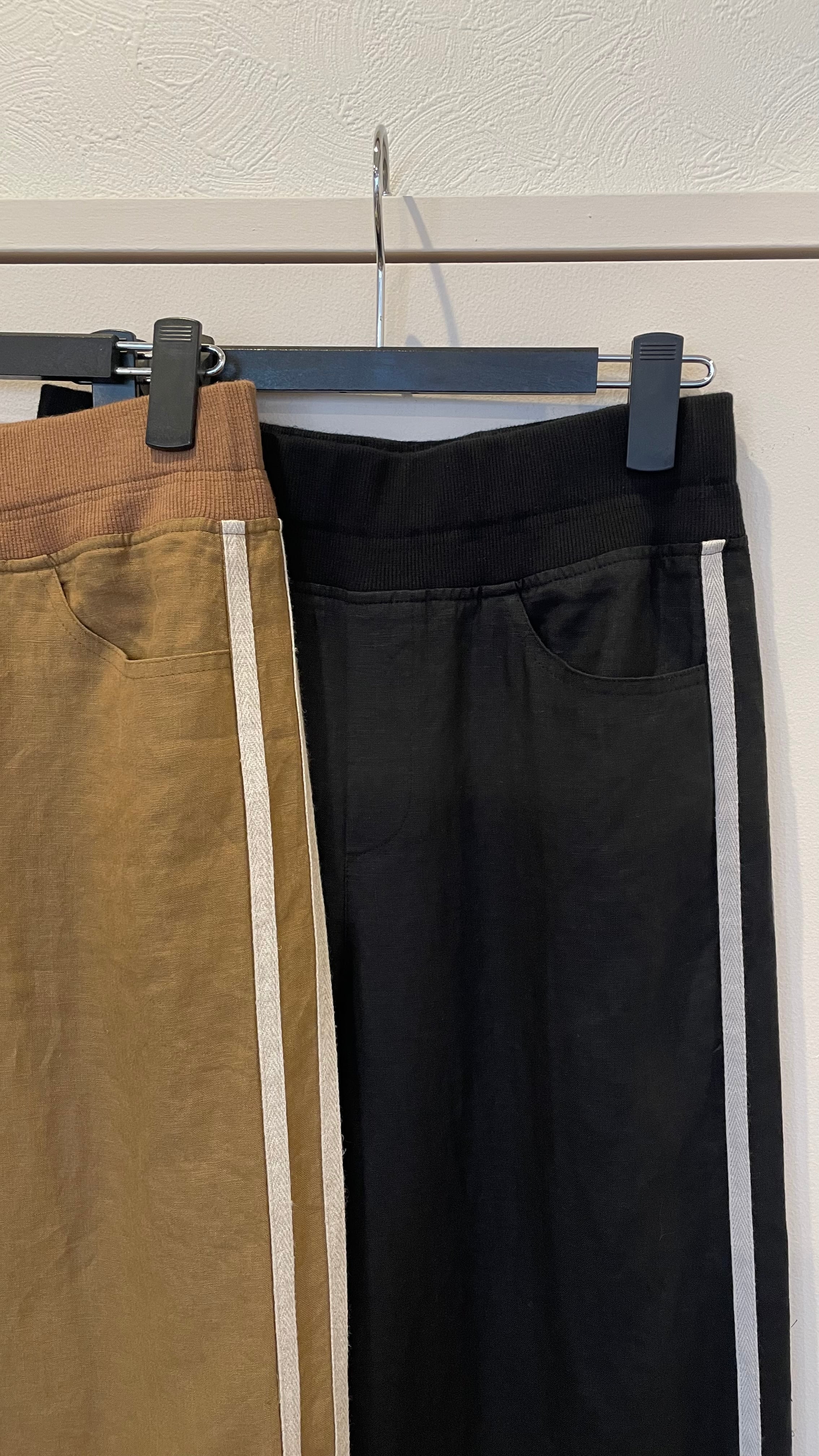 リネン素材を使用し、通気性が良く涼し気なサイドライン(左側のみラインあり)パンツです◎
